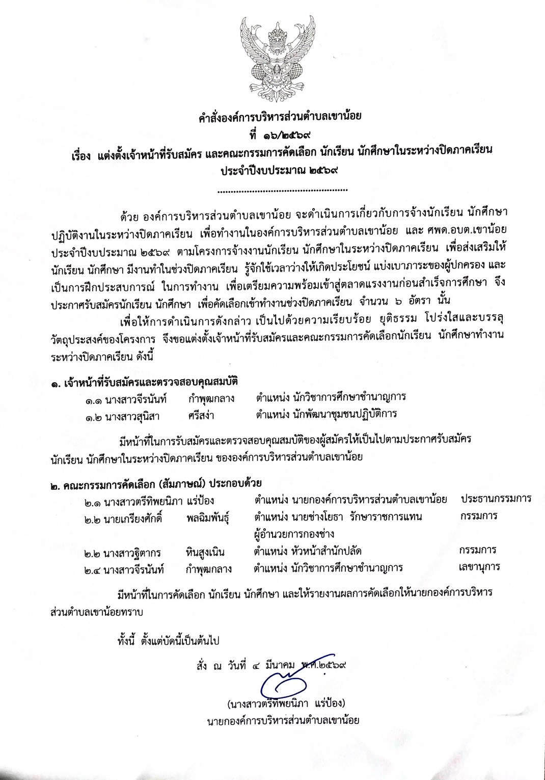 ในฐานะผู้บริหารองค์การบริหารส่วนตำบลเขาน้อย ดิฉันจะปฏิบัติหน้าที่ด้วยความซื่อสัตย์ โปร่งใส เที่ยงธรรม และตรวจสอบได้ โดยยึดหลักธรรมาภิบาล ต่อต้านการทุจริตคอร์รัปชันทุกรูปแบบ เน้นประโยชน์ส่วนรวมมากกว่าประโยชน์ส่วนตน เพื่อสร้างวัฒนธรรมองค์กรที่สุจริตและยั่งยืน