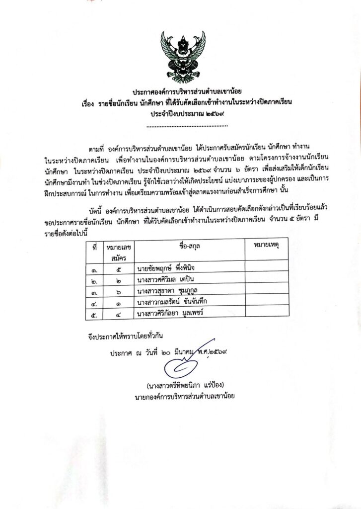 เรื่อง รายชื่อนักเรียน นักศึกษาที่ได้รับคัดเลือกเข้าทำงานในระหวางปิดภาคเรียน