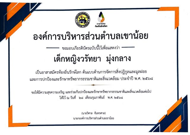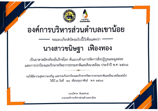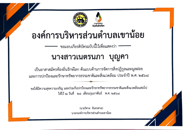องค์การบริหารส่วนตำบลเขาน้อยมอบเกียรติบัติอาสาสมัครท้องถิ่นรักษ์โลกผู้เป็นต้นแบบด้านการจัดการสิ่งปฏิกูลและมูลฝอยและการป้องกันและรักษาทรัพยากรธรรมชาติและสิ่งแวดล้อม ประจำปี พ.ศ.2568